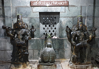 நிமிடத்திற்கு, நிமிடம் ஐயாயிரம் உருவங்கள் எடுத்த சம்பாசுரனை அடக்கியதாலும், ஹிரண்யகசிபுவின் ஒரு துளி உதிரம் சிந்தினால் அதில் ஆயிரமாயிரம் அரக்கர்கள் தோன்றுவார்கள் என்பதால் அவனுடைய குருதியைத் தம் திருமேனியில் ஏற்றமையாலும், நரசிம்மருடைய கோபாக்னி உக்ரம் பலத்துப் பெருகி அண்ட சராசரத்தையே ஆட்டுவித்தது. அனைத்தும் இறைலீலைகள் தாமே! ஸ்ரீசரபேஸ்வரரும், ஸ்ரீநரசிம்மரை ‘சாந்தாம்ருதகுண பாவனையில்’ அரவணைத்து அவருடைய கோபாக்னி உக்ரத்தையும், உதிரபஸ்ம அக்னியையும், ‘அசுர உதிர வேகப் பிரவேசக் கிரியையும்’ பாவன சாந்தி செய்தார். இது நிகழ்ந்ததும் ஒரு விஷ்ணுபதிப் புண்யகாலத்தில் தாம்!